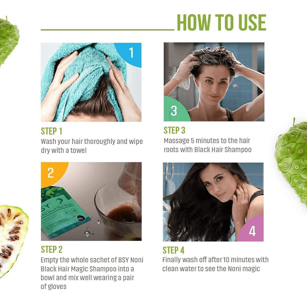 BSY Noni Dark Brown Hair Color Shampoo is a Shampoo based hair dye which Colors your grey hair to Dark Brown in 5 minutes! BSY Noni Dark Brown Hair Color Shampoo is based on the pure extract of genuine Hawaiian Noni fruit, which is medicinally the most effective variety of Morinda Citrifolia of the genus Morinda. BSY Noni Dark Brown Hair Color Shampoo is a fruit based dye product formulated with various herbal essences for hair nutrition. It is a product developed by years- long research of health experts and scientists. The herbal ingredients can rapidly turn the hair brown naturally and keeps it healthy. Besides Coloring hair it also has nourishing properties which can supply essential nutrients to hair roots. BSY Noni Dark Brown Hair Color Shampoo won't damage hair and scalp as it contains no harmful chemicals. It’s a 100% Ammonia free product.