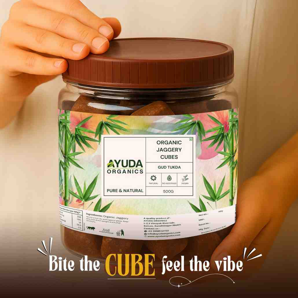 Sweetness from nature in its finest form! Fresh sugarcane juice, prepared traditionally without the use of chemicals, bleach, or preservatives, is used to make Ayuda Organics' Organic Jaggery Cubes. Conveniently shaped into bite-sized cubes, jaggery retains all of its natural nutrients, including potassium, magnesium, and iron, making it a better substitute for refined sugar.